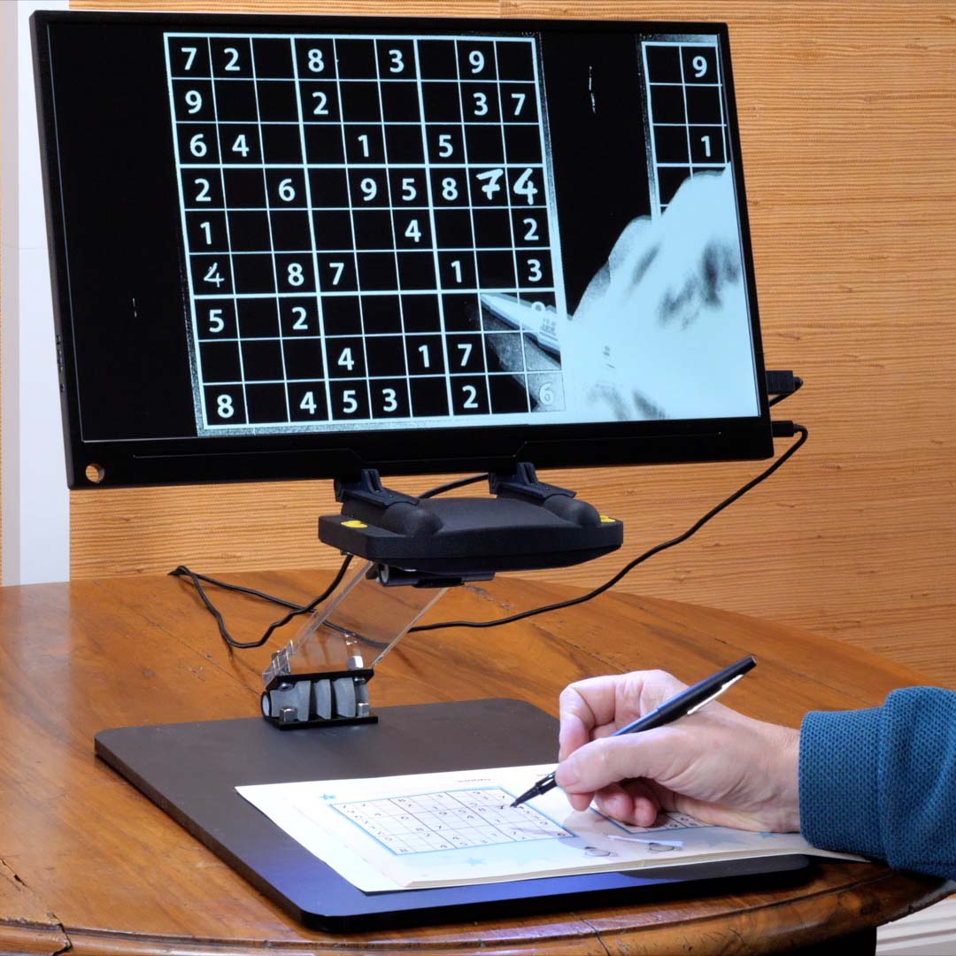 Ce nouveau téléagrandisseur autofocus couleur Full HD dispose d'un Zoom 2x à 32x et d'un écran 47 cm (19 pouces). Léger (3.2 kg écran compris), il peut également se connecter sur écran externe full HD (1080p). Lecture, écriture, mots croisés, travaux manuels : il est idéal pour ceux qui recherchent une solution efficace, simple, facile à transporter. En savoir plus sur ce téléagrandisseur.